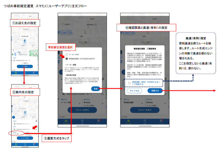 現在の事前確定運賃は、配車アプリからの注文に限られる。また、現状はスマたくのみ。