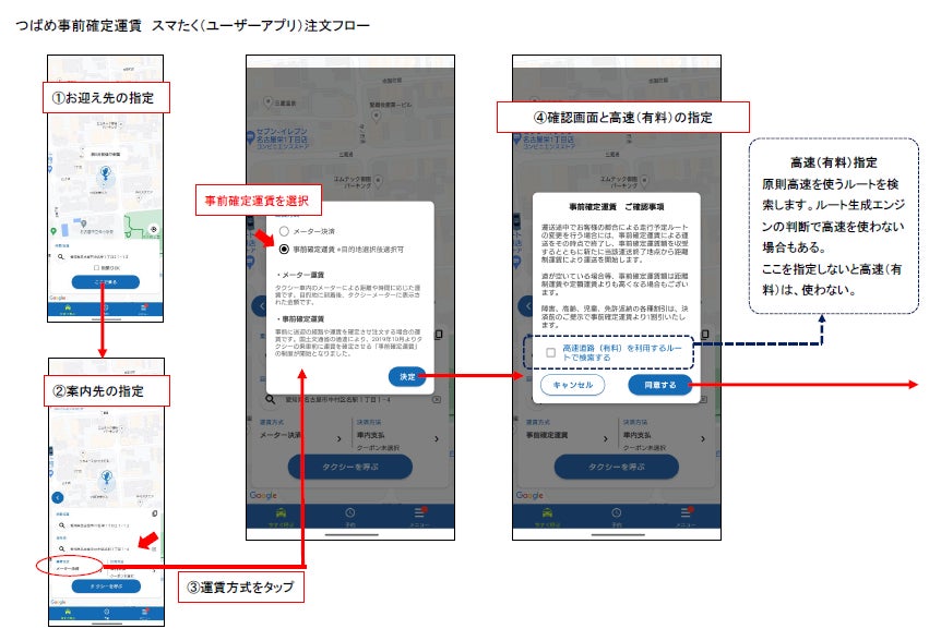 名古屋市大手タクシー企業つばめタクシーグループは、全国初の「タクシー事前確定運賃」を国土交通省によるサービス実施の認可初日となる令和6年3月1日(金)より自社開発アプリ「スマたく」にて開始。