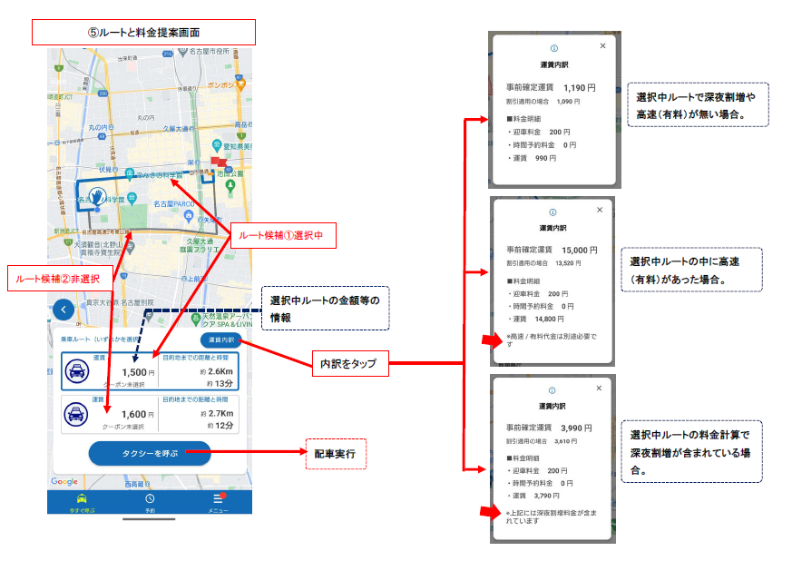 しかし、事前確定運賃は、距離に係数を掛けて計算されるため、通常のメーター料金に含まれない金額となり、利用者は事前に確定した料金で安心して移動できるようになる。