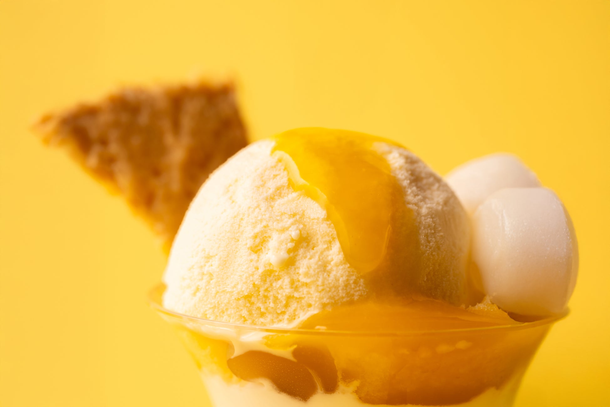 梅ピューレゼリーの爽やかさ、杏仁豆腐の滑らかさ、生クリームとアイスクリームのコクに加え、アーモンドやグラノーラの香ばしさと歯ごたえがあります。さらに白餡や白玉、カステラに梅ピューレソースが絡み、和と洋の魅力が絶妙に10層で調和した特別感あふれる一品です。