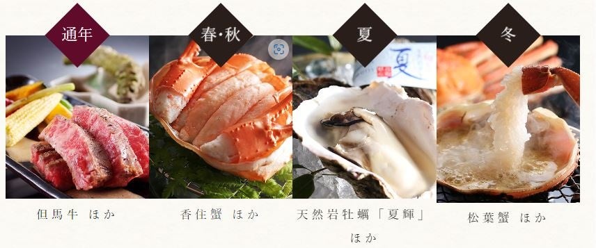 春・夏は「香住(かすみ)ガニ」、夏は天然岩ガキ「夏輝(なつき)」や「白イカ」、冬は「松葉ガニ」といった山陰/季節のランクアップ食材を使用したプランもご用意しております。