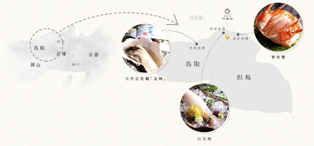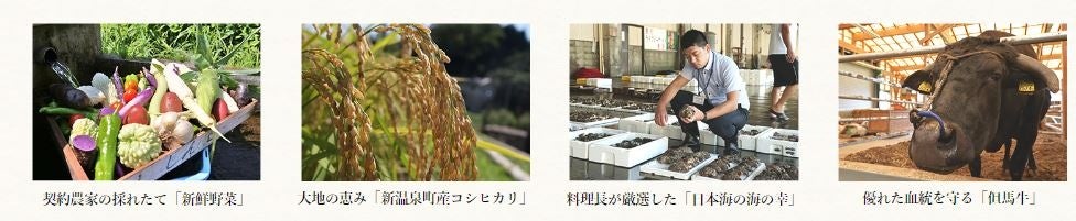 日本海の漁港で仕入れる海の幸、地元の農家で栽培された採れたての新鮮野菜、但馬の大地で育った新温泉町産こしひかりなど地場の食材をふんだんに使用し、四季折々の食材を彩り豊かに仕上げています。