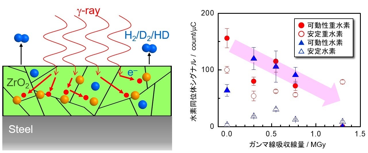 核融合炉では、燃料となる水素同位体(重水素、三重水素)が炉内の材料に留まることで、燃料効率の低下や放射性同位体である三重水素による被曝のリスクの増加が懸念されています。本研究では、水素同位体の透過漏洩や構造材料の腐食を低減するために設置することが検討されている酸化ジルコニウム被覆に対して、重水素を導入した後に室温でガンマ線照射することで、照射前と比較して被覆内の重水素濃度が減少することを発見しました。また、被覆内の水素同位体の存在状態や、照射する環境によって、ガンマ線による影響が異なることを明らかにしました。この結果により、これまで核融合炉の材料中に蓄積された水素同位体を除去するために運転を停止し長期間の加熱処理が必要と考えられていたのに対し、核融合炉内で発生するガンマ線で水素同位体を除去できる可能性を示しました。この成果は、核融合炉の燃料効率および安全性向上に資する基盤技術となるのみならず、材料中の水素制御技術全般に革新的な知見をもたらすものとして、今後広く応用されることが期待されます。