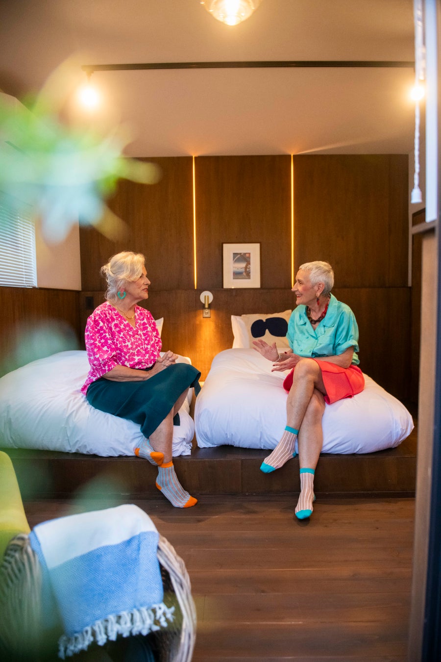 4月20日〜24日まで、4日にわたる東京滞在において、一般的な日本滞在ツアーでは難しいミクロ視点での街案内やアテンドを行いました。3人のインスピレーションを元に日々行程を組み、途中北品川で味わったほうじ茶に感動されたことから、お店に買いにいくなど、日本窓口を務める水谷氏と連携した柔軟なフォローアップ体制に留意。ご高齢でもあるため体調を第一に無理のないようスケジュール調整を適宜行いました。先日開業した泉岳寺の一棟貸しホテル「HOTEL Rin TOKYO」(※1)に宿泊滞在。旅の疲れが出てきたであろう日本ツアー後半にあって、体力をリカバーでき、東京でのイベントなどを精力的にこなすことができたと、嬉しいコメントとともに、刺繍作品もプレゼントしていただきました。作品は滞在されたお客様の気持ちも明るくなればと「HOTEL Rin TOKYO」にディスプレイ。彼女たちならではの色彩感覚が、日本民家をリノベーションした空間に彩りを添えてくれています。