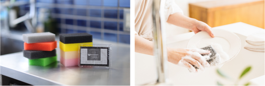 ダイニチ・コーポレーションは創業から、食器洗い用固形洗剤の製造販売を行っています。製造から販売を行う中で、固形洗剤と相性の良いスポンジを研究し、高品質ポリウレタンを使用した、従来のスポンジの概念を覆す「サンサンスポンジ」が生まれました。半年以上使えるほど丈夫で長持ちなので、ごみの削減に。泡立ちが早く、そして、泡切れ、水切れが抜群のため節水にも繋がります。また、圧縮されたわずか7mmのパッケージで届くので収納場所にも困りません。「洗い物に費やす時間に“ときめき”」をモットーに、利用いただく方の声にお応えしつつ、コスパよく、ずっと使いたい商品を作りを続けています。