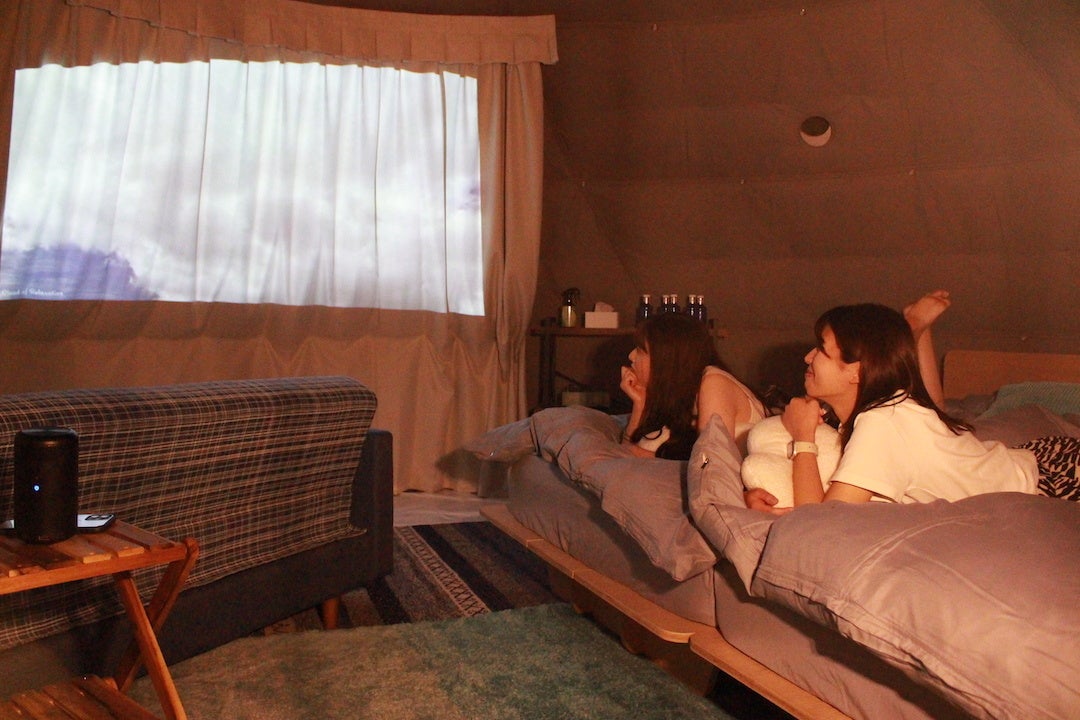 プロジェクターは壁にはもちろん、天井にも投影可能です。施設には無料でお使いいただけるWi-Fiがあるので、お好きな動画や映画を見ながら映画館にいるような気分で、ゆっくりとおくつろぎいただけます。