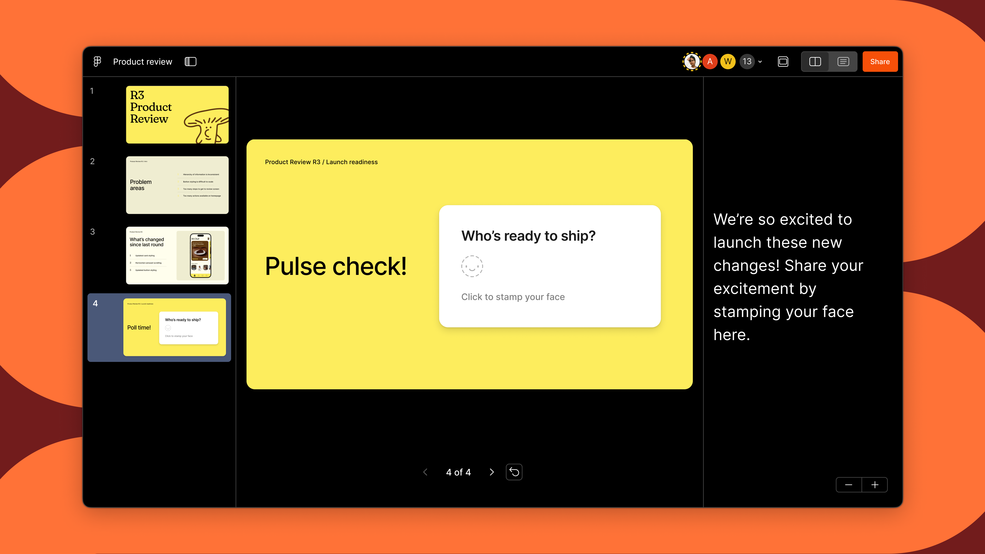 プロのデザイナーとコラボレーターのための新製品で、ブランドに合わせたプレゼンテーションを作成し、提供することで、一体感を生み出します。Figma Slidesは、Figmaのデザイン能力とコラボレーション型のプレゼンテーションツールを1つにしたことで、心を打つストーリーテリングを実現し、チームやオーディエンスのエンゲージメントを高めます。
