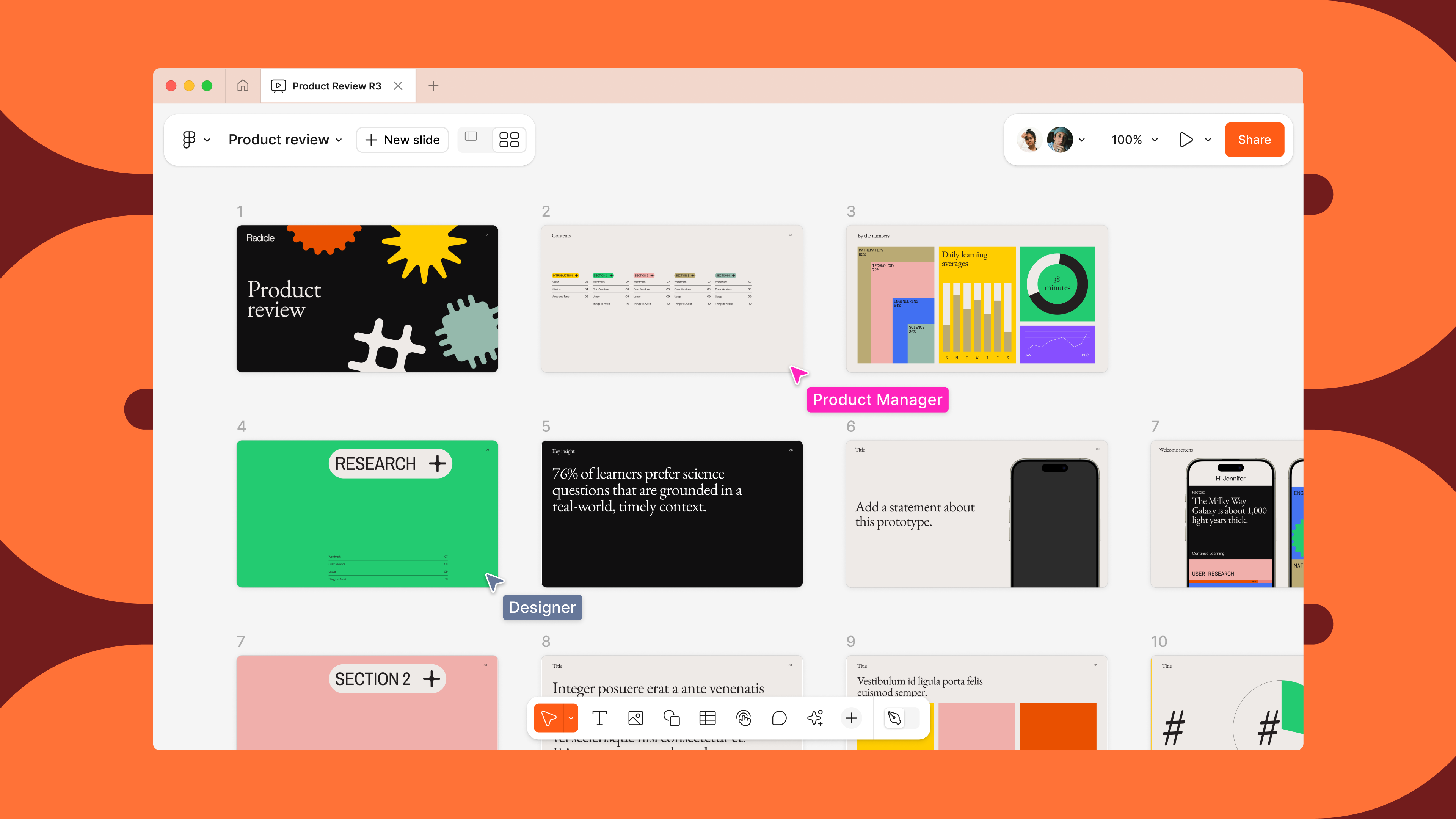 Figmaは、そのコラボレーション機能、パワフルなデザインツール、そして作業中のプロトタイプを埋め込む機能により、すでに多くのデザイナーに愛用されているプレゼンテーションツールです。昨年1年間で、約350万ものスライドファイルがFigmaでデザインされました。Figma Slidesは、プレゼンテーション専用に設計されているため、誰でもプロのデザイナーのように美しくデザインされたデッキを作成、構築、発表することができます。