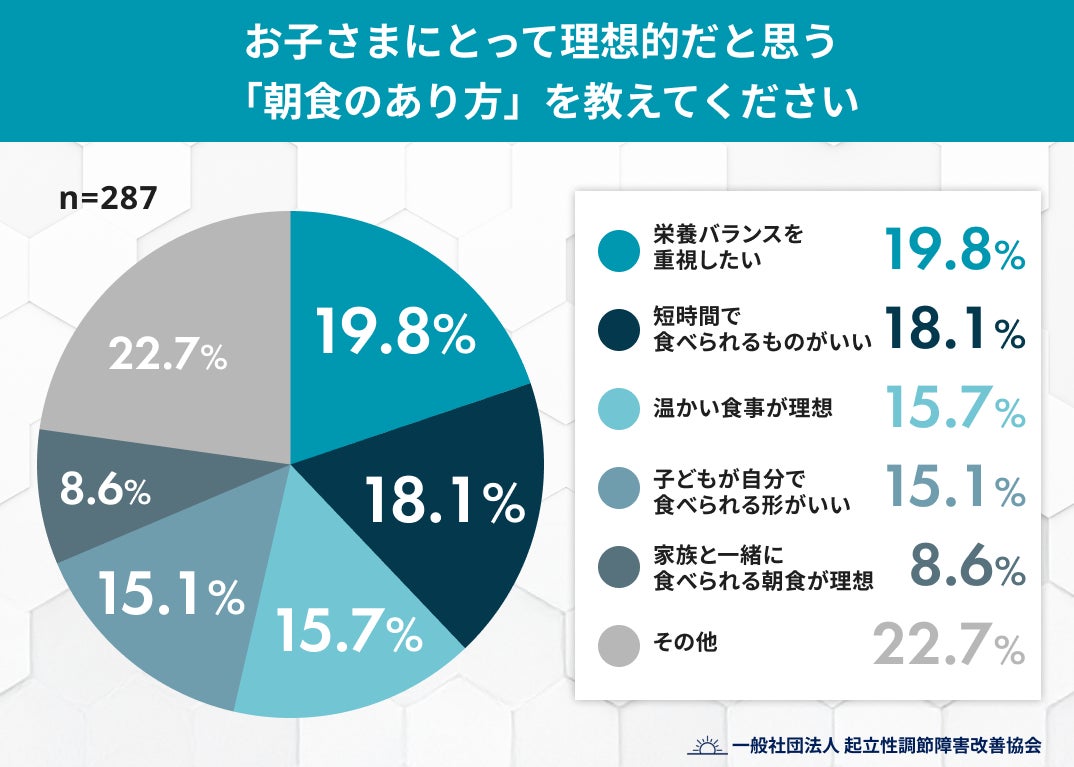 起立性調節障害(OD)やその傾向をもつ子どもの多くが、朝食を十分に食べられず困っているという声が保護者から寄せられています。一般社団法人 起立性調節障害改善協会は、小学生〜高校生の子どもを持つ保護者287名を対象に「朝食と起立性調節障害」に関する調査を実施。その結果、約8割の子どもが毎日またはだいたい食べられている一方で、起床時の体調不良により食欲低下や時間不足に悩む家庭も多い実態が見えてきました。食べられない理由や、家庭で行われている工夫、理想の朝食像などを通じて、子どもの“朝のつまずき”に寄り添うヒントが浮かび上がります。
