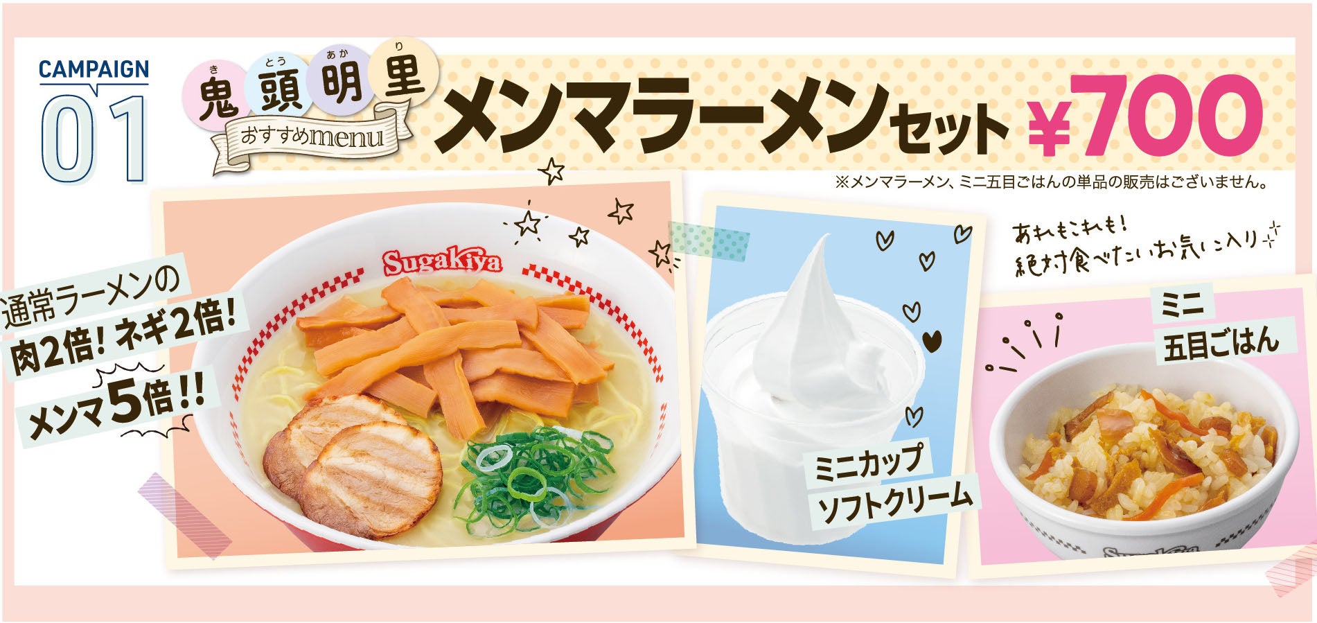 メンマたっぷりのラーメンに肉やネギも多め、ミニソフトやミニ五目ごはんも付いた、期間限定の鬼頭明里おすすめメニューです。