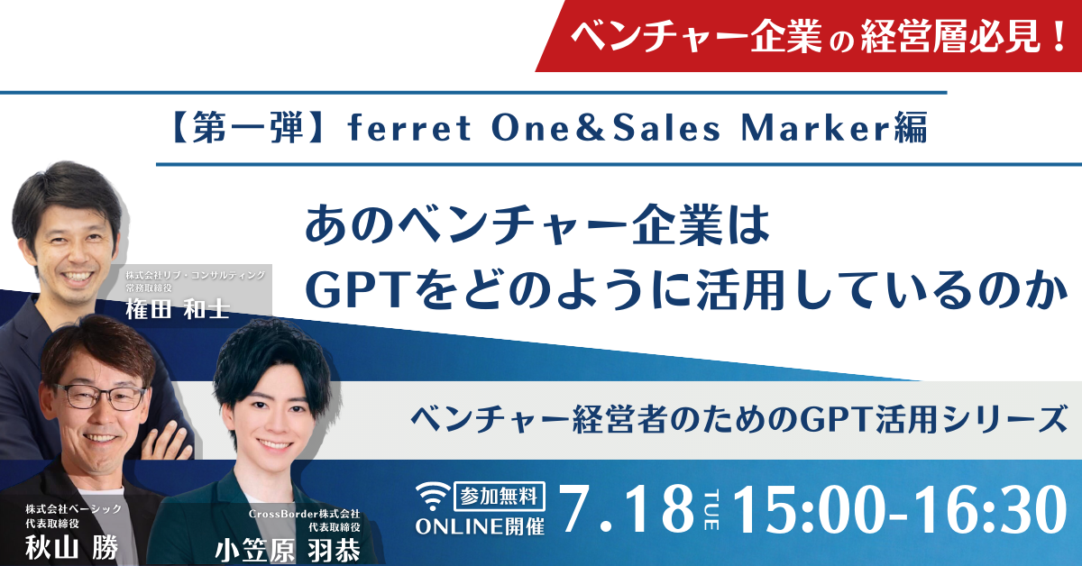 本セミナーは「ベンチャー経営者のためのChatGPT活用シリーズ」の第一弾です。先進的にChatGPTを活用したサービス取り組みの先進事例として、ベーシック社のFerret OneとともにCrossBorderのSales Markerを紹介します。
