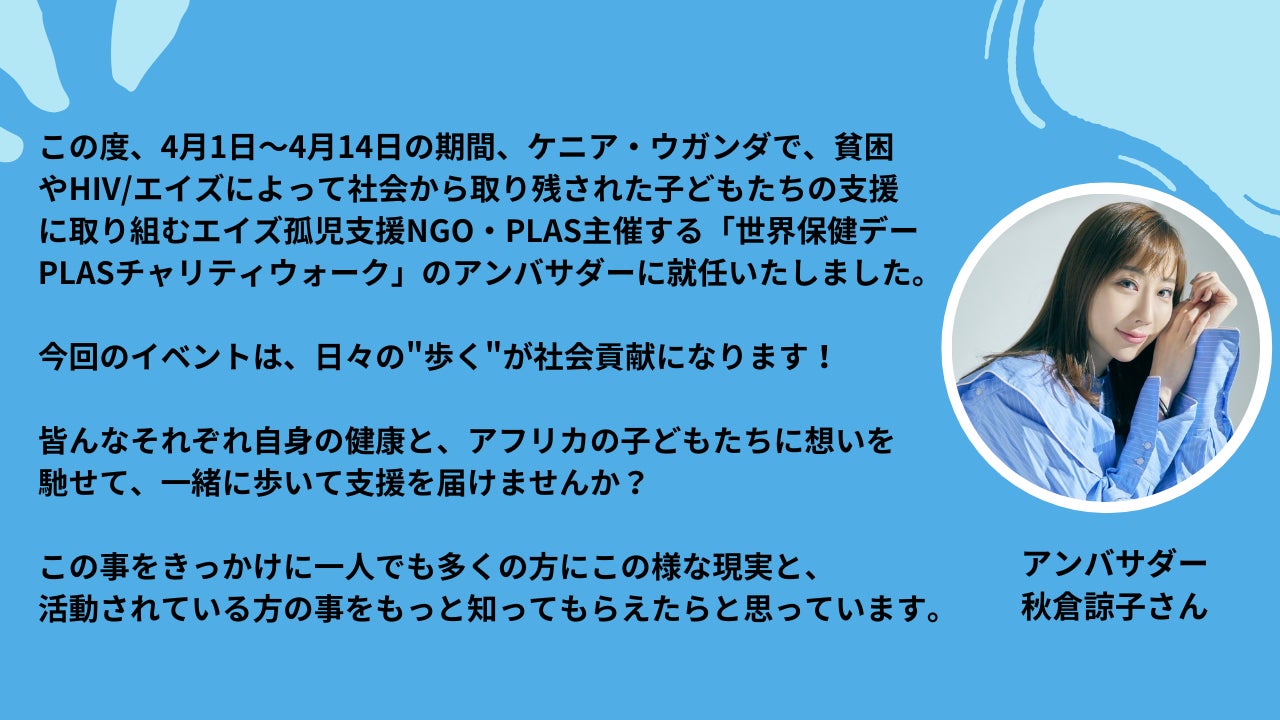 【秋倉諒子さんアンバサダー就任】歩いてチャリティ!世界保健デーPLASチャリティーウォークをオンラインで開催