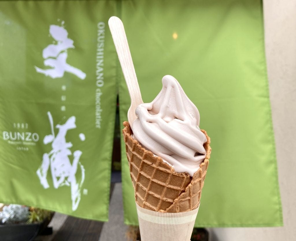 ルート沿いには大人気の生チョコのお店「奥信濃BUNZO」があり、店内で絶品生チョコソフトクリームやカフェ、スイーツが楽しめます。