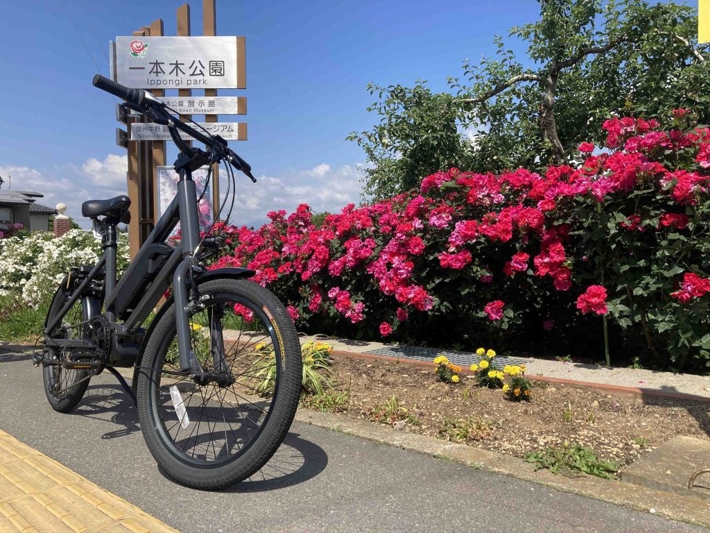 桜の次に楽しめるのはこちら、中野市一本木公園の「バラ」。5月下旬から6月上旬、850種3000株におよぶバラの花が見頃を迎えます。この場所にはカワイイ小径タイプのE-BIKEがお似合い。安心してください、見た目とは裏腹にアシストは快適、上り坂もスイスイ進みます。