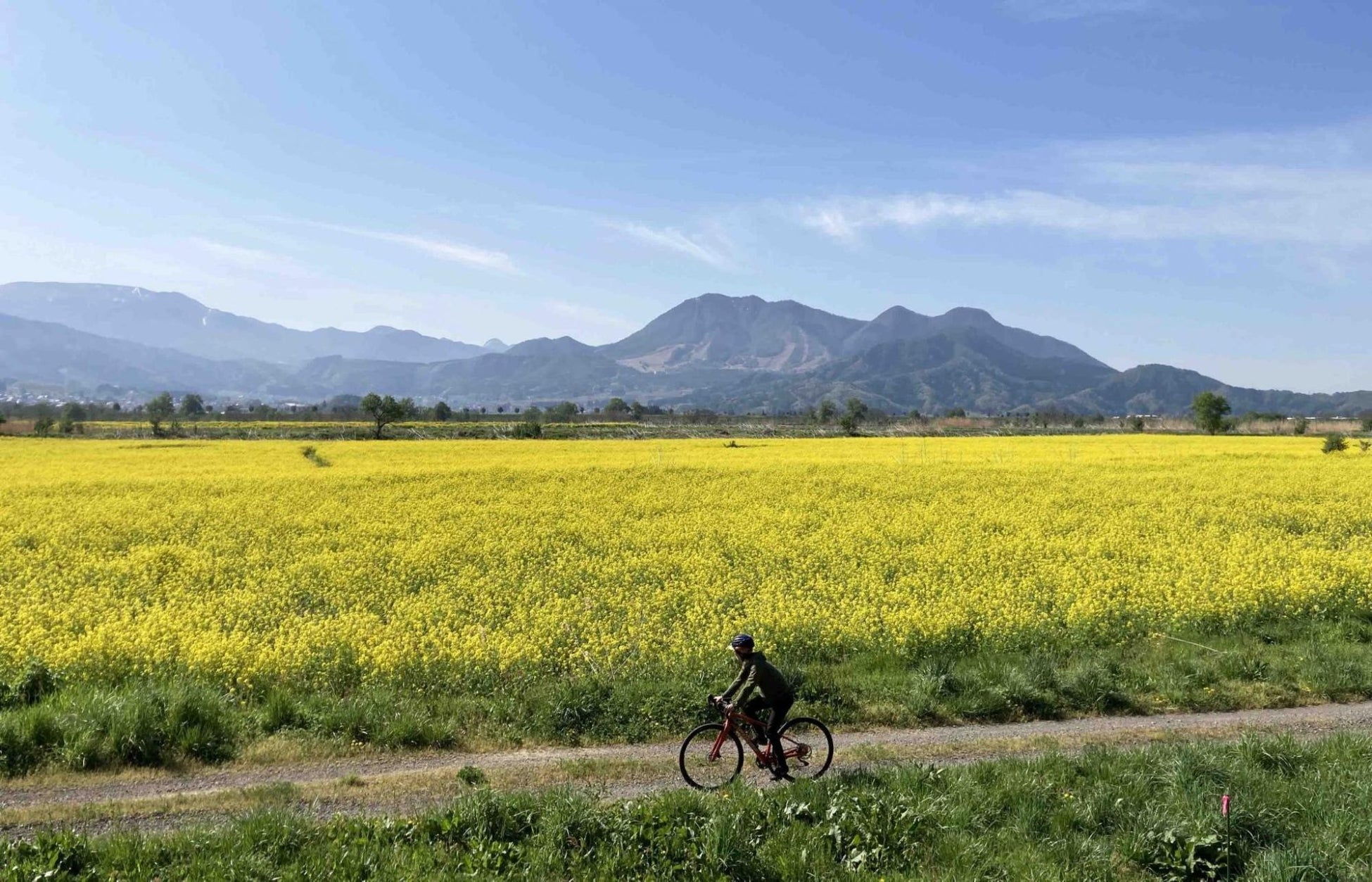 道の駅花の駅千曲川の眼下に広がる一面の菜の花畑は圧巻!グラベルバイクなら菜の花畑のすぐそばをサイクリングすることもできます。