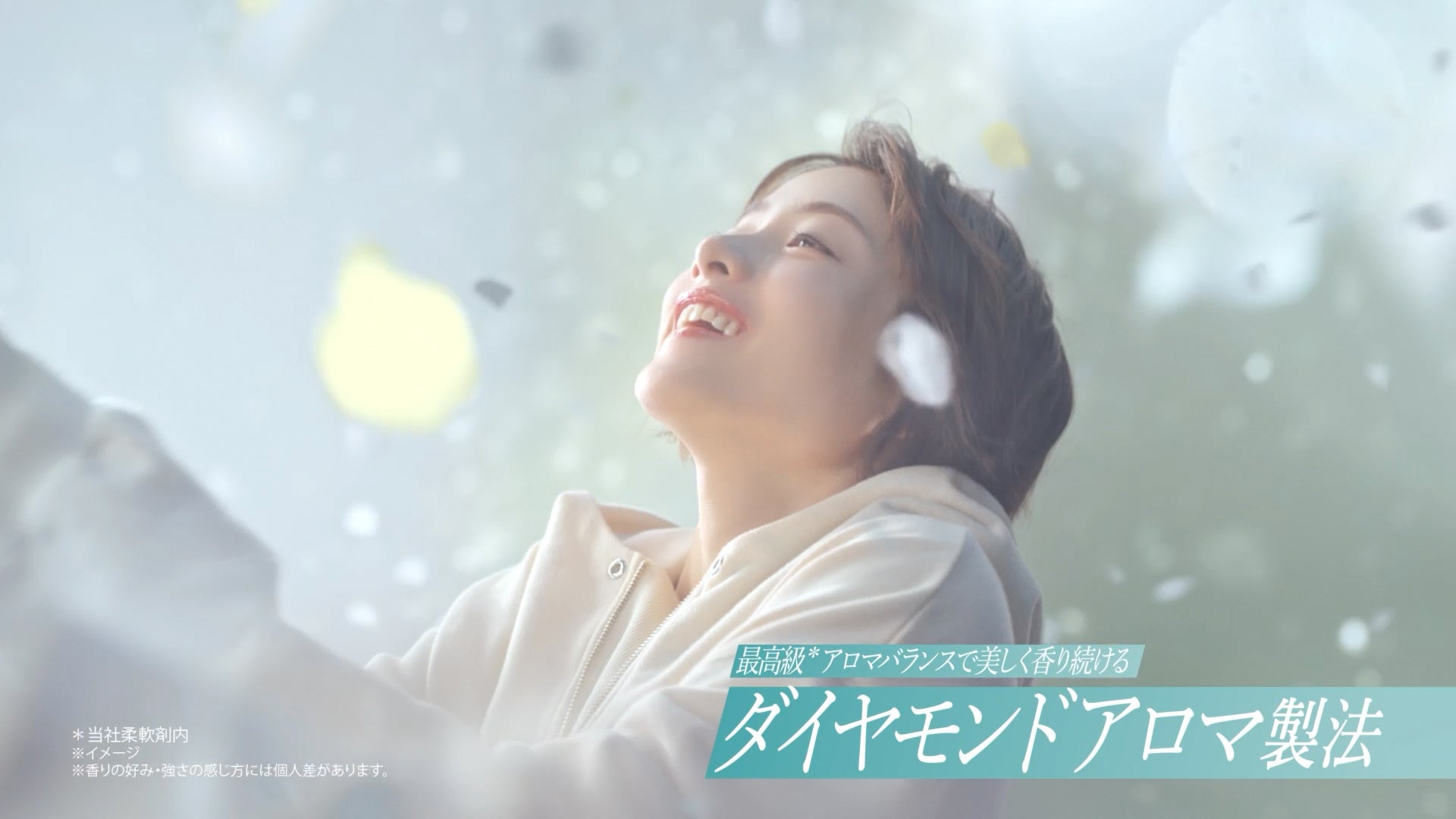 今回の新TVCMでは、「ダイヤモンドアロマ製法」を採用し新しく生まれ変わった「ハミングフレア」のいい香りを石原さんが体感。