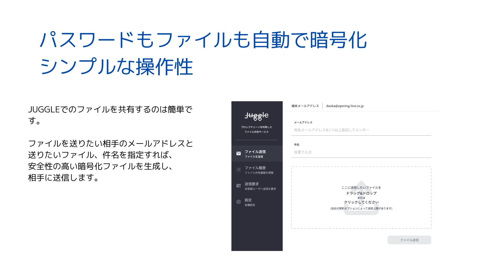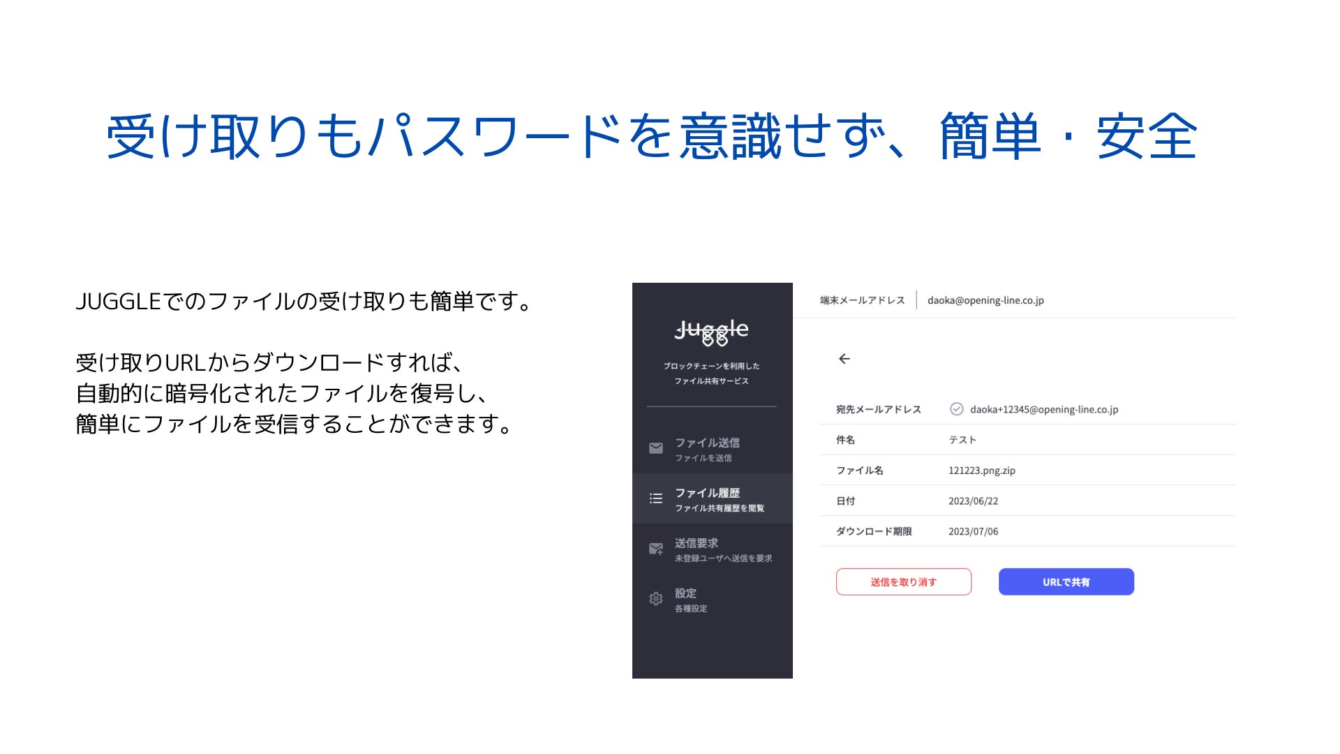 ブロックチェーン技術と公開鍵暗号技術を活用することで、従来の暗号化ZIPファイルの共有(所謂PPAP)で必要だった面倒なパスワード入力を不要とし、簡単で安全なファイル共有を実現します。