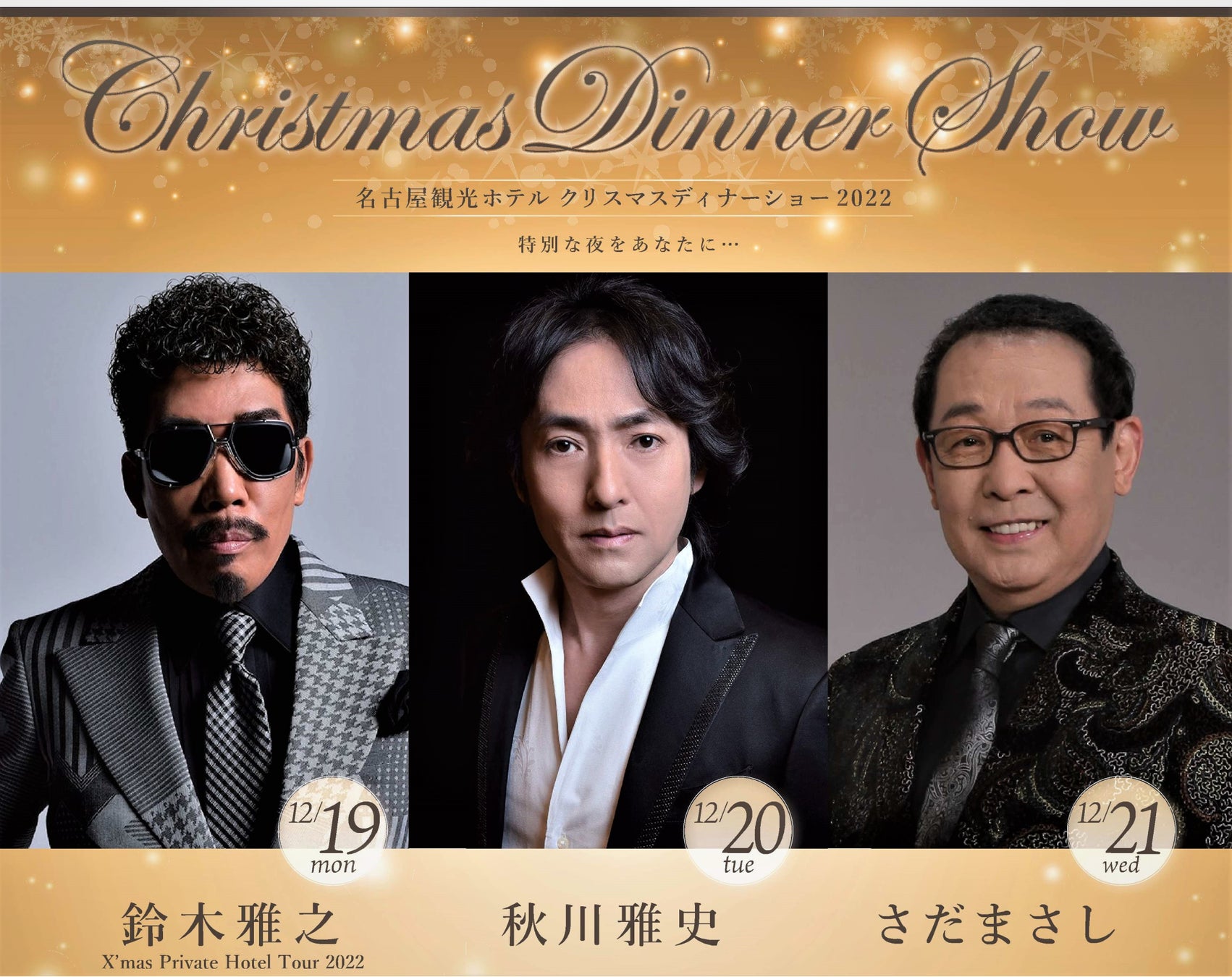 名古屋観光ホテル(名古屋市中区錦一丁目 19 番 30 号 総支配人 中神章裕)は、3年ぶりにクリスマスディナーショーを開催いたします。12月19日は当ホテルでは初開催となる「鈴木雅之」、20日は伸びやかな歌声に定評のある「秋川雅史」、21日は名古屋観光ホテルのディナーショーの定番「さだまさし」と3日間にわたりステージを彩る豪華なアーティストが勢ぞろいいたします。シェフが腕をふるう華やかなディナーコースとともに、一夜限りの至高のショーをお楽しみください。