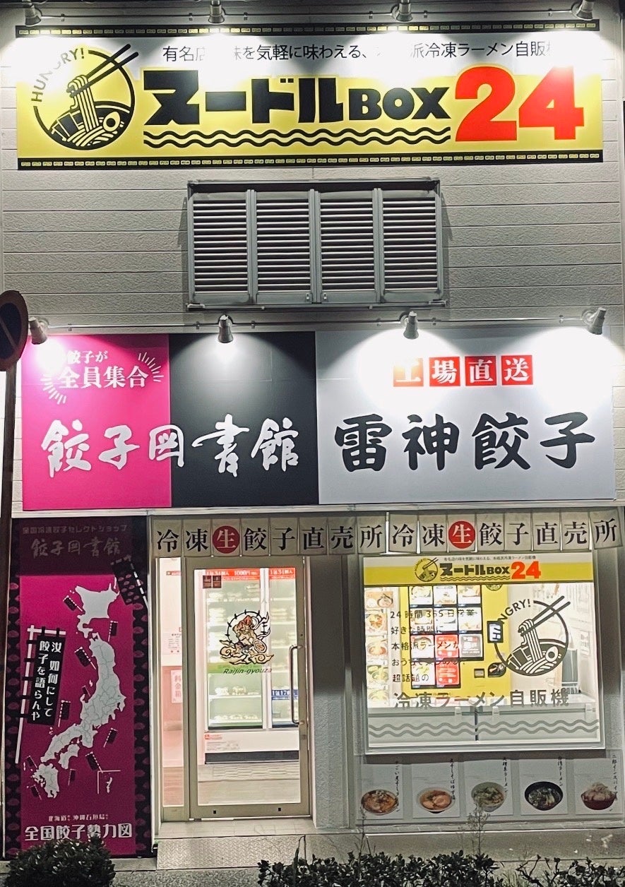 餃子・油そばなどを取り扱う無人販売所「雷神餃子」(全国で18か所)の運営ならびにヌードルツアーズをはじめとする100か所以上の冷凍自販機にて餃子を販売する株式会社雷神(本社:千葉県松戸市、代表取締役:加藤 裕之、以下:雷神)と、全国の人気餃子を集める冷凍餃子無人販売処、冷凍餃子自販機運営およびフランチャイズを主な事業とする株式会社餃子図書館(本社:東京都中央区、代表取締役CEO:三浦 大介、代表取締役COO:峯岸 純也)は、雷神餃子「千葉・市川妙典店(千葉県市川市)」「大阪・苅田店(大阪府大阪市)」「大阪・堺上店(大阪府堺市)」のまずは3店舗内に『餃子図書館』コーナーを設ける展開をはじめます。これにより、雷神餃子にご来店の皆さまには、雷神餃子の既存メニューに加え、餃子図書館が扱う全国の名店餃子を月替わりで楽しんでいただけるようになります。