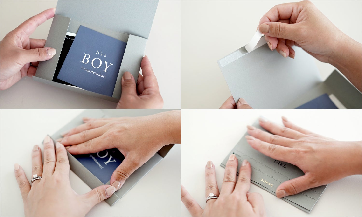 赤ちゃんの性別がわかったら、BOYもしくはGIRLのカードを表向きにしてケースに入れます。このときエコー写真やマタニティフォトを一緒に入れるのもおすすめです。セットできたらケースの線に沿って折り、両面テープの剥離紙を剥がして封をすれば完成! カードの裏面にメッセージを書いても◎。