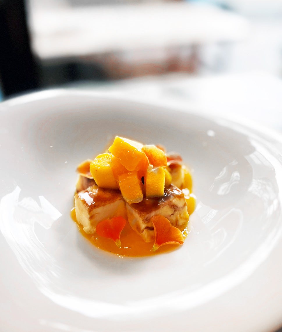 なめらかなカタラーナとアップルマンゴーの甘みと酸味のバランスの組合せを楽しんで。