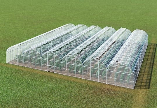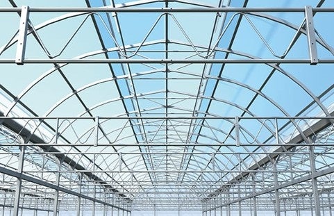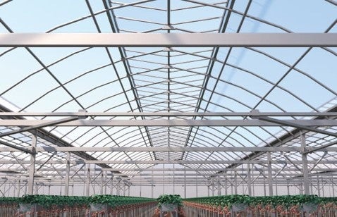 G-Castle ProⅠは、一般社団法人 日本施設園芸協会が推奨する「日本型大型(1ha)標準モデル」 に準じ開発した新型ハウスです。大型アーチと水平梁をトラス構造で補強することにより、高軒高でありながらアーチピッチを極限まで広げ、高い採光率を確保しています。大きな空間、高換気効率、高採光性を実現しながら 耐候性も高く、安心かつ高収量が期待できるハウスです。
