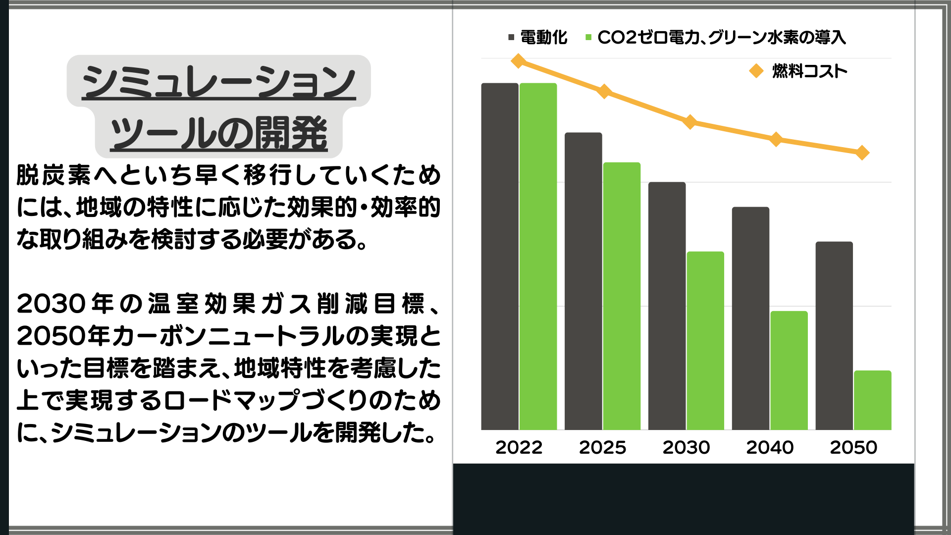 脱炭素へといち早く移行していくためには、地域の特性に応じた効果的・効率的な取り組みを検討する必要があります。2030 年の温室効果ガスの削減目標と、2050 年カーボンニュートラルの実現といった目標を踏まえ、地域特性を考慮したうえで実現するロードマップづくりのために、本実証実験ではシミュレーションのツールを開発し、長期的なエネルギー転換計画または脱炭素計画の検討が可能となりました。