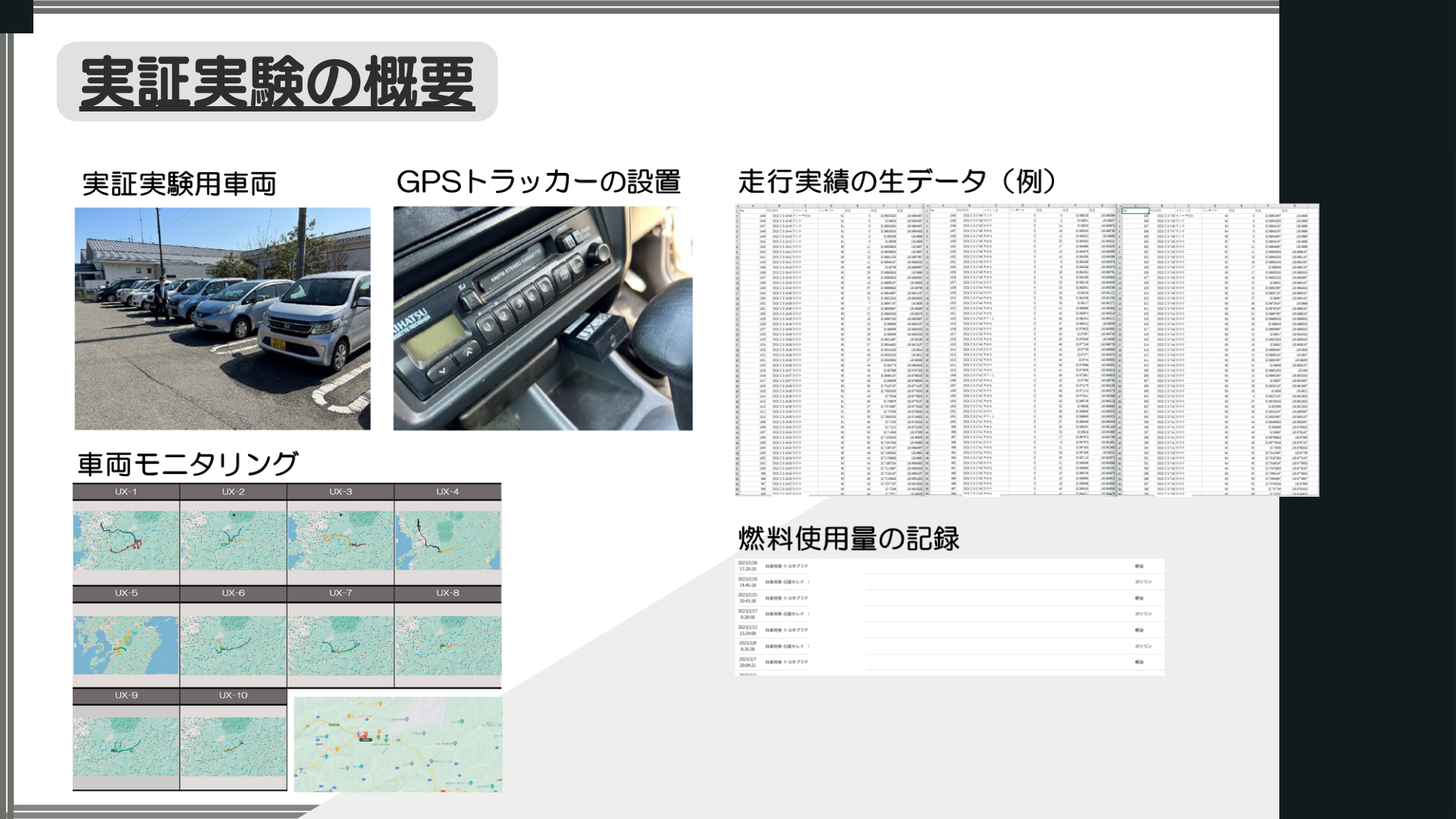 1. 概要:熊本県のUXアクセラレーションプログラム2022の支援を受けて、「燃料ベース手法」と「距離ベース手法」を組み合わせた測定方法を採用し、IoTデバイスとWEBアプリを通じて走行距離と燃料使用量をモニタリングすることで、より透明性のあるCO2排出量の算定と、持続可能な社会の実現に貢献する自動車分野のソリューションを提案することを目的とした事業である。
