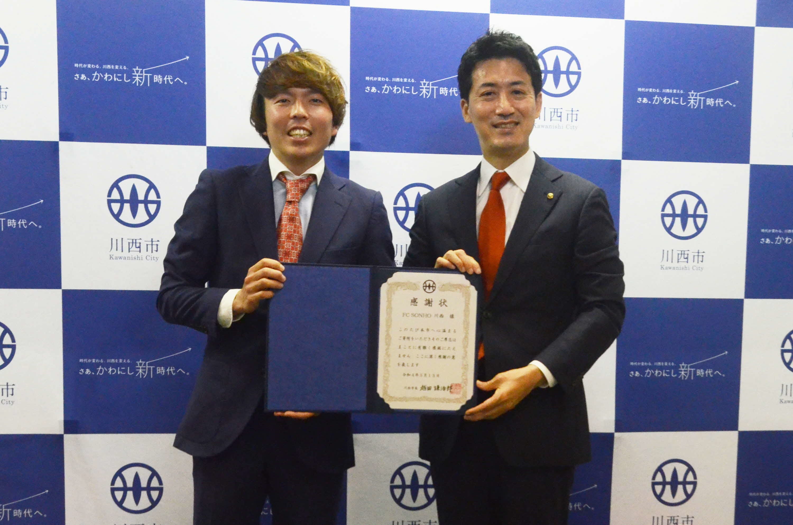 5月13日、市内のサッカークラブ「FC SONHO(ソニオ)川西 代表:小川直毅さん(おがわ なおき)」からサッカーボールの寄贈があった。寄贈されたサッカーボールは市内の市立幼稚園や認定こども園、保育所で使用される。