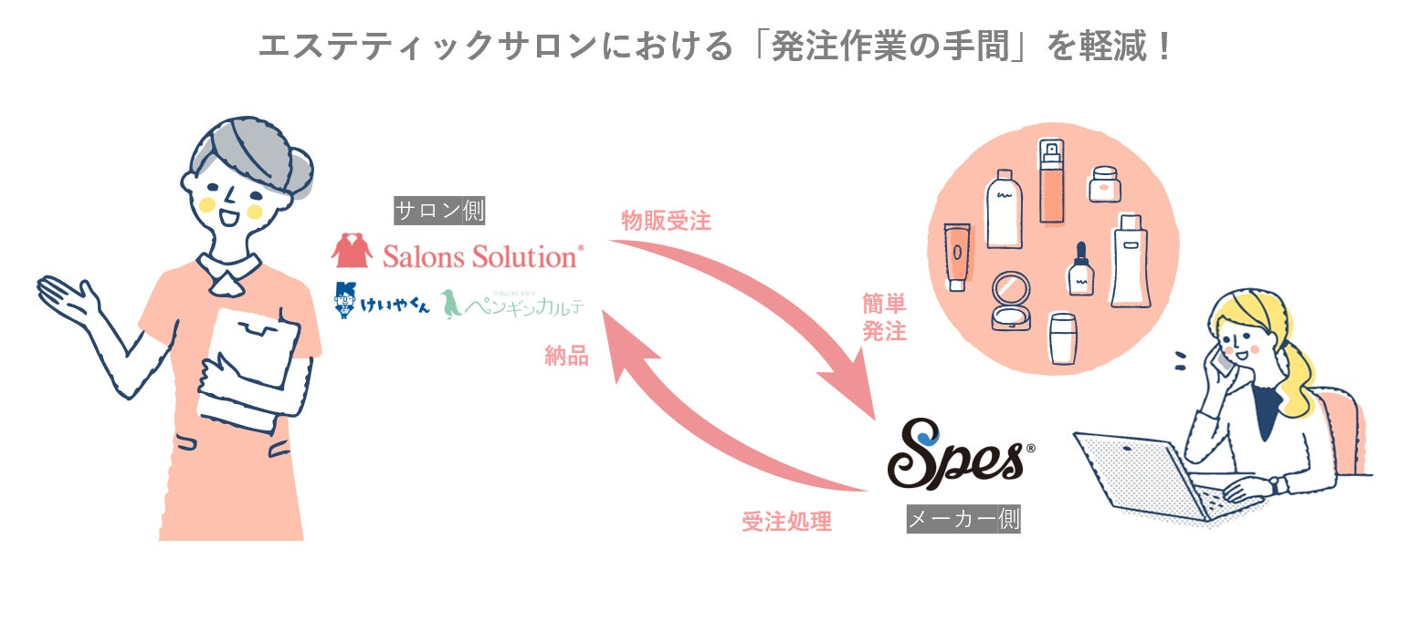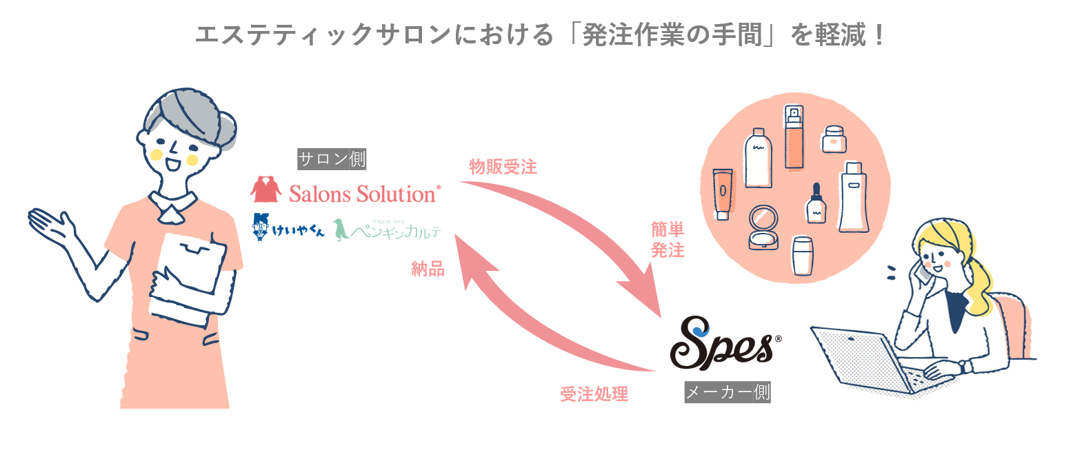 まずはエスティックサロン様に向けて「Salons Solution」内に、簡単に発注が行える新機能を公開いたします。同時にその受注を「Spes」側で受け取れる機能を有償サブスクリプション契約として、メーカー様に提供いたします。