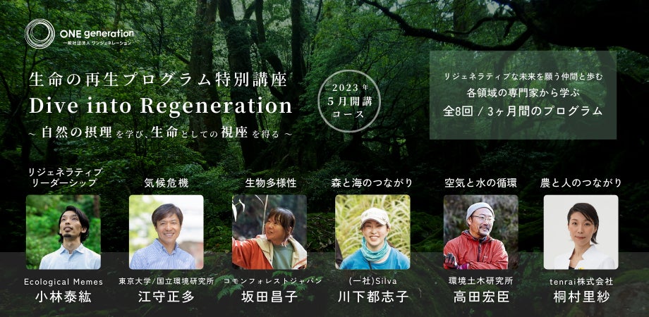 生命が継がれ続ける「Regeneration of Life」をビジョンに掲げ、様々な活動を行う一般社団法人ワンジェネレーション(所在地・東京都中央区、代表理事・鮎川詢裕子、久保田あや、以下ワンジェネレーション)は、自然の摂理を学び、生命としての視座を得ることを目的に、リジェネラティブな未来を願う仲間と歩む生命の再生プログラム特別講座「Dive into Regeneration」を開講します。