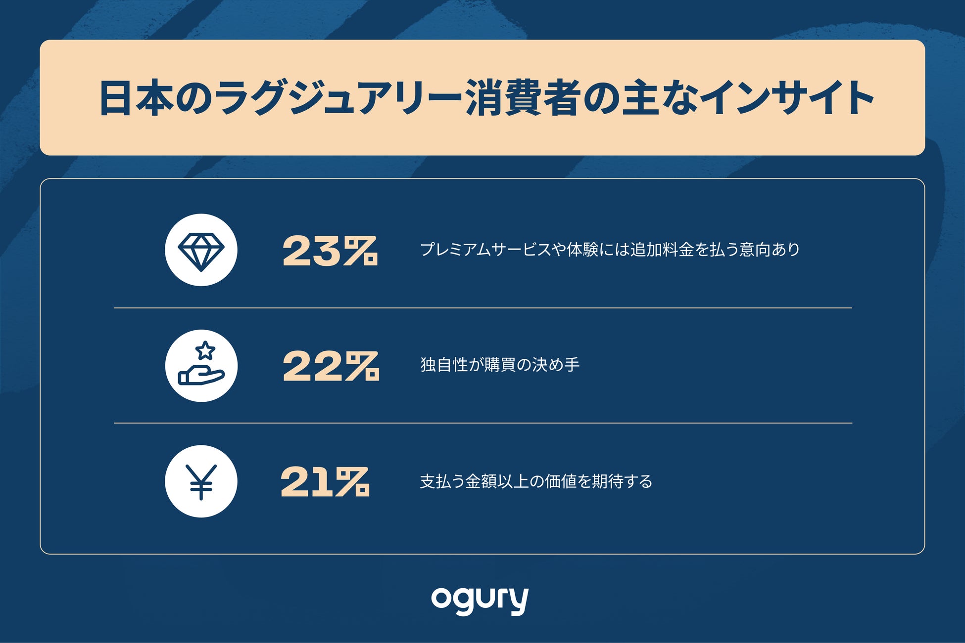 世界の高級ブランド市場は長らく堅調に成長を続けてきましたが、2024年にはインフレや景気不透明感を背景に2%縮小し、約5,000万人の消費者が市場から離れました。こうした状況を受け、Oguryは7,561人(うち日本は最大規模の2,793人)を対象に調査を実施。その結果、日本の消費者が高級ブランドを購入する際の動機が多様化し、「価格に見合うかどうか」や「価格以上の体験」に強い関心を寄せていることが明らかになりました。