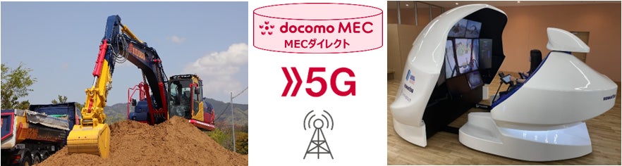 また、EARTHBRAINが開発した遠隔操作用コックピットでは、建設機械から送られた高精細映像により、前後左右や作業機を確認しながら、実際の運転席同様に、臨場感のある遠隔操作を行うことができます。遠隔操作に必要な現場の映像や制御信号の送受信には、NTTコミュニケーションズ株式会社の協力のもと、高速・大容量・低遅延を特長とした5Gを利用しており、建設現場と遠隔操作拠点間を5Gおよびクラウド基盤(「docomo MEC™」※1、「MECダイレクト®」※2)で接続します。