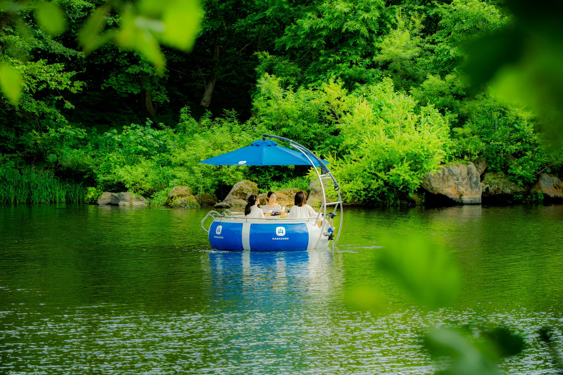 会場となるのはHANAZONO内にある木々に囲まれたウォーターエリア。ニセコアンヌプリ山からの雪解け水が流れ込む水面に、北海道初上陸の電動ドーナツボートを浮かべ、自身で操縦するスタイルです。清涼な山の空気に包まれながら、水面から眺める景色と共に非日常の優雅なひとときをお過ごしいただけます。