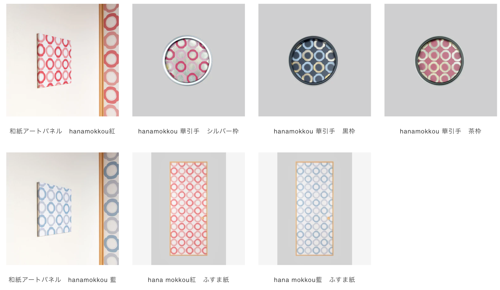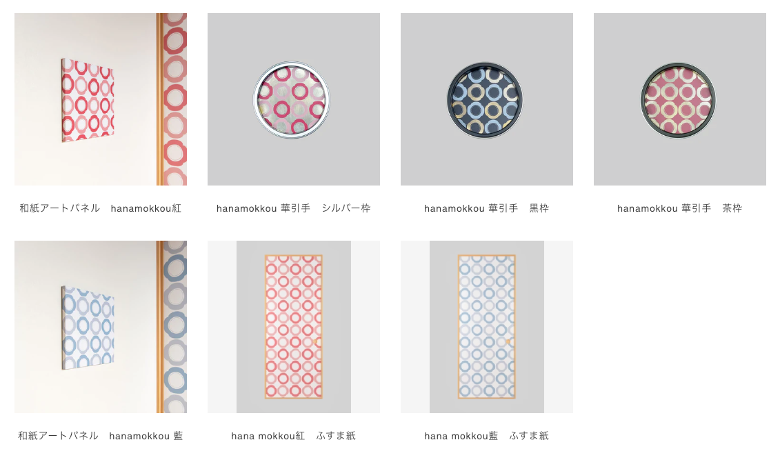 今回は、この「hana mokkou」の新柄を、ふすま紙・華引手・和紙アートパネルの3つの商品にて販売開始いたしました。