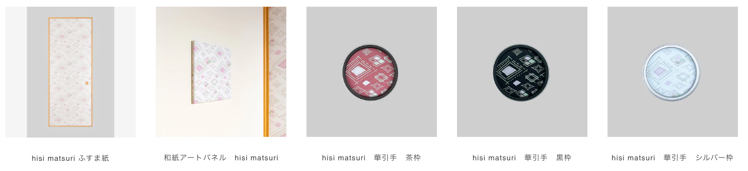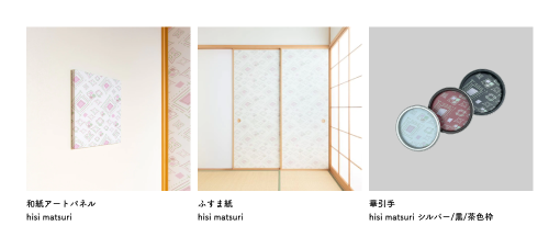 今回は、この「hisi matsuri」の新柄を、ふすま紙・華引手・和紙アートパネルの3つの商品にて販売開始いたしました。