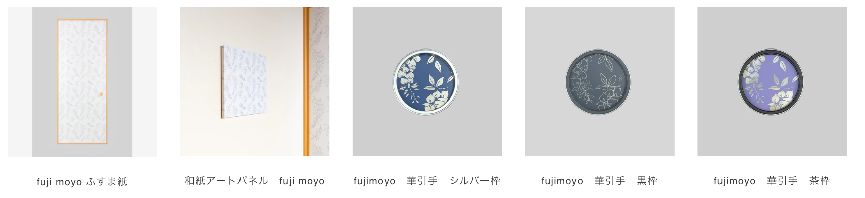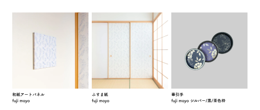 シンプルな模様でありながら、オシャレな北欧っぽさもあり、和室にも洋室にも合わせやすいデザインになっています。今回は、この「fujimoyo」の新柄を、ふすま紙・華引手・和紙アートパネルの3つの商品にて販売開始いたしました。