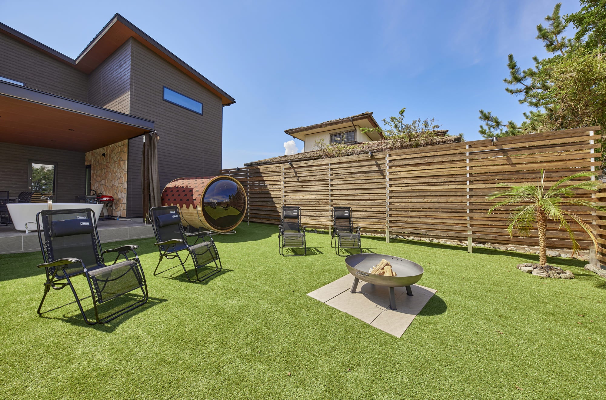 お庭にはバレルサウナ、水風呂、ジャグジーを設置しておりリラックスした時間をお過ごしいただけます。また屋外キッチンとBBQ用コンロも設置しておりますのでBBQをしながらお食事を楽しんでいただくこともできます。