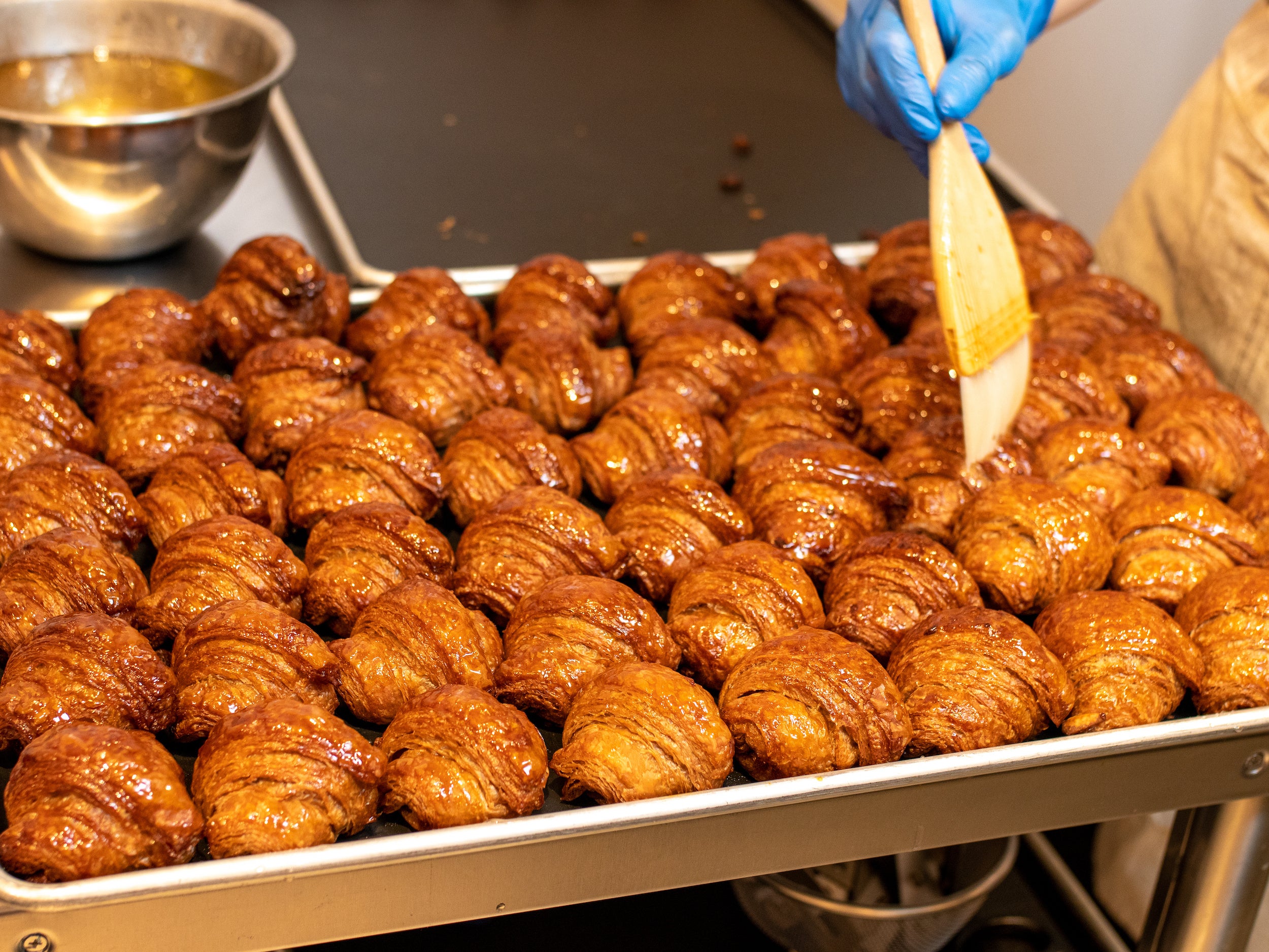ミニヨンのクロワッサンは、食感に徹底的にこだわり、 機械では再現できない食感を出すために創業以来ずっと手作業で、 クロワッサン生地を折る“手折り製法”で生地を作っております。