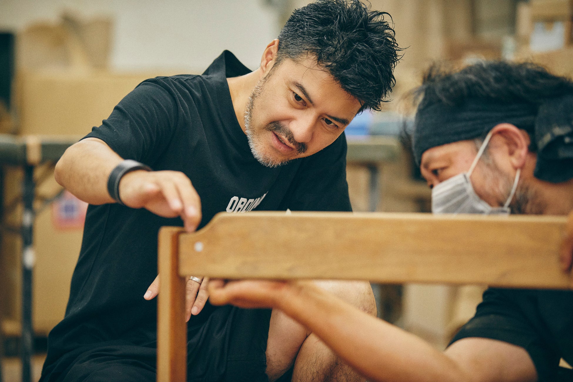 以前から「オールドマルニ」のプロダクトの魅力を感じてくれていた藤井氏。今回、本企画に向けて、マルニ木工の家具作りの原点に触れるべく、広島にある本社工場にも足を運び、職人等との対話を通してその技術や素材の可能性を肌で感じていただき、より深くリノベーション家具の監修に携わっていただきました。