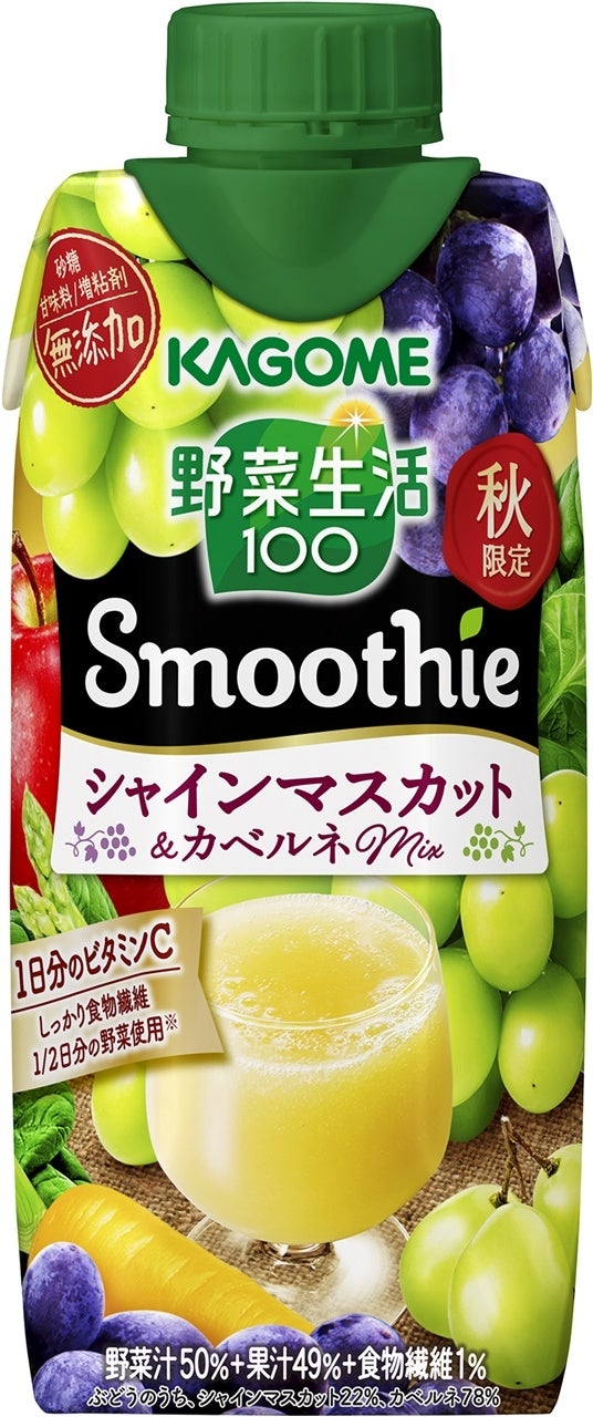 秋限定で発売する「野菜生活100 Smoothie シャインマスカット&カベルネMix」は、シャインマスカットの爽やかな甘みとカベルネ・ソーヴィニヨンの重厚な香りをお楽しみいただけます(ぶどうのうち、シャインマスカット22%、カベルネ78%)。1日分のビタミンC※2と食物繊維が摂れます。