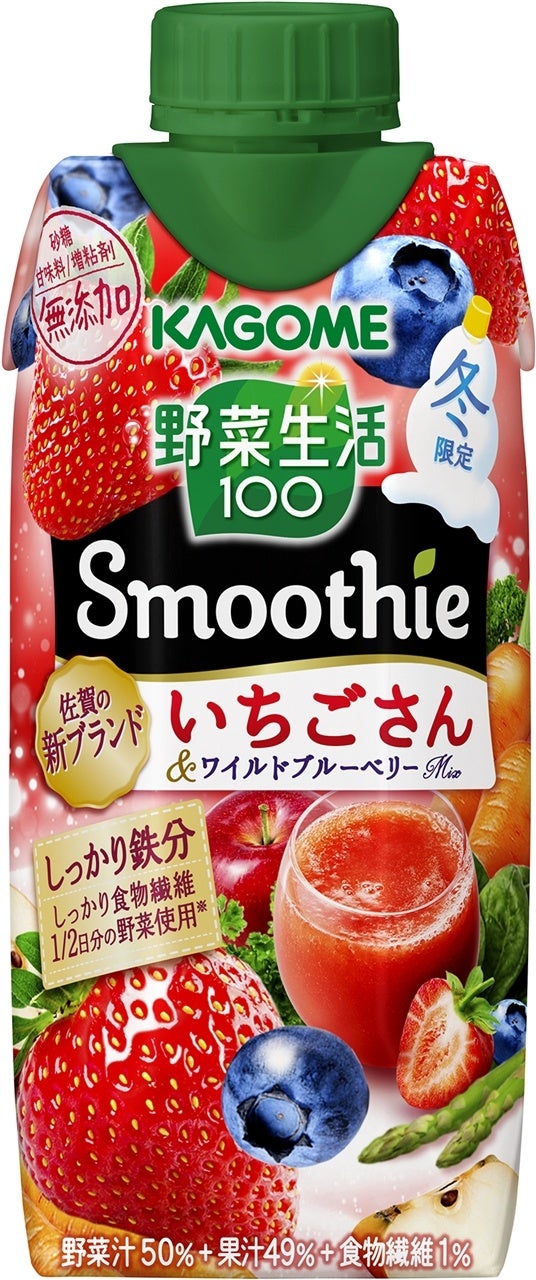 冬限定で発売する「野菜生活100 Smoothieいちごさん&ワイルドベリーMix」は、18年秋にデビューした佐賀県産の新ブランドいちご「いちごさん」の甘酸っぱい甘みとほのかに香るブルーベリーがお楽しみいただけます。食物繊維と鉄分がしっかり摂れるのもうれしいポイントです。