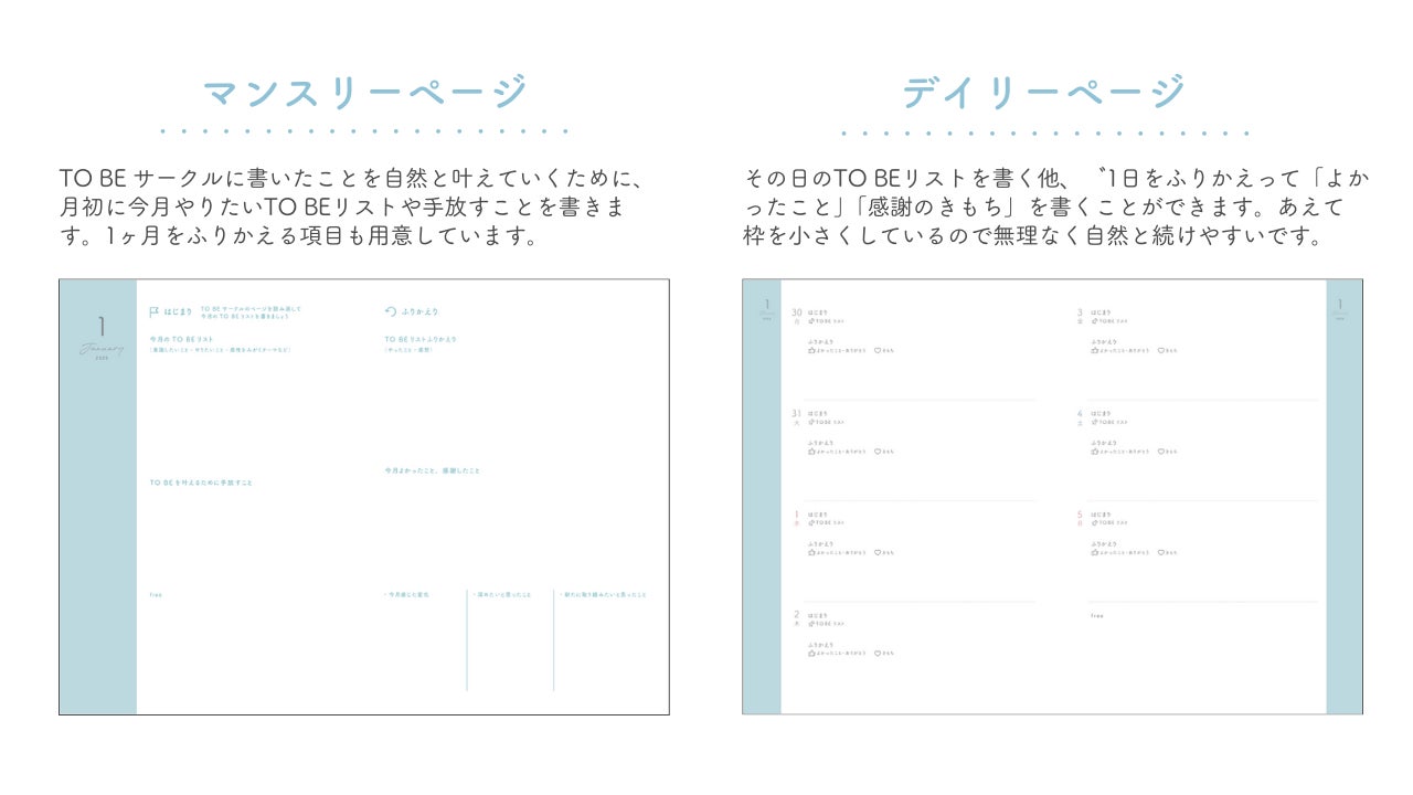 TO BE思考」でありたい自分に自然と少しずつ変化していくことができる、まじめながんばりやさんのための手帳です。