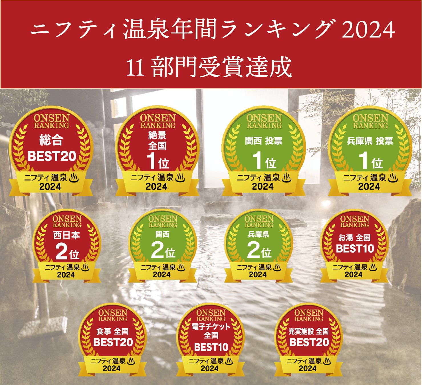 この度、”ニフティ温泉年間ランキング2024”において『関西ユーザー投票』『絶景』『兵庫県ユーザー投票』から「有馬街道温泉すずらんの湯」が1位を受賞しました!