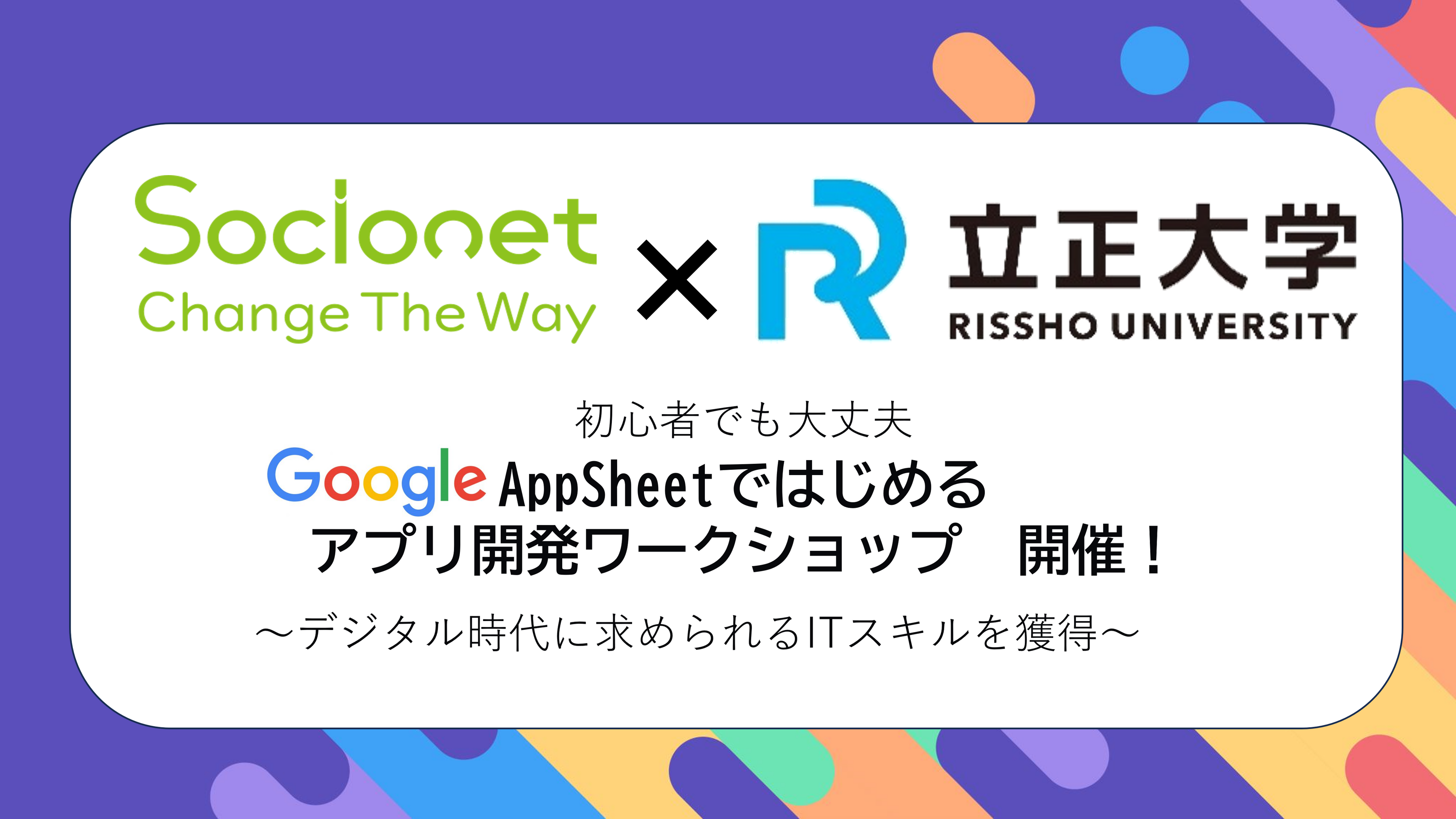 そこでソシオネットでは、未来を担う若者への貢献の一環として、立正大学の学生向けに「AppSheetではじめるアプリ開発ワークショップ」を開催させていただくこととなりました。