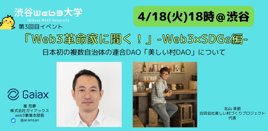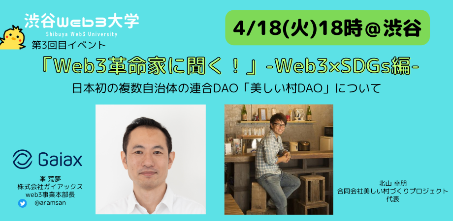毎回満席となるWeb3の最先端の現場で挑戦している方をお呼びする渋谷Web3大学のイベント。第3回目「Web3革命家に聞く!」-Web3×SDGs編-を4月18日渋谷スクランブルスクエアで開催します!