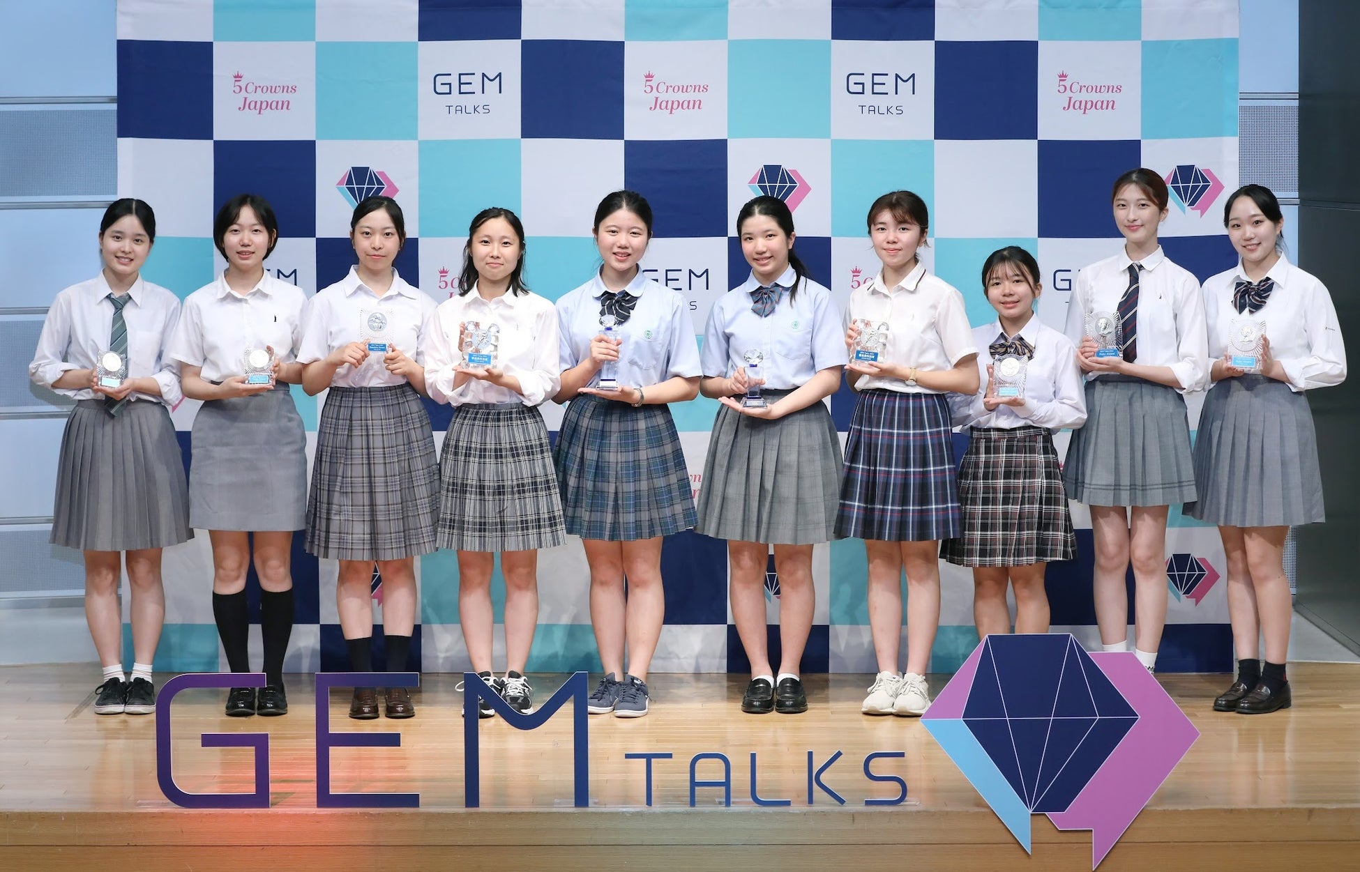 世界5大ミスコンテスト歴代日本代表有志による社会貢献団体「5 Crowns Japan」(所在:東京都文京区)は、外務省後援の下、全国高校生英語プレゼンテーションキャンプ『GEM Talks 2024』ファイナル決選大会を2024年7月28日(日)に東京ウィメンズプラザ(渋谷区)にて開催しました。本企画は、高校生のチャレンジマインド育成と、表現力、コミュニケーション力の向上を目的とした、ワークショップと英語プレゼンテーションコンテスト複合型の特別プログラムです。全国から寄せられた多数の応募の中から、厳正なる予選審査を経て選出された10名の高校生ファイナリストたちが「私の未来予想図」をテーマに白熱したプレゼンテーションを行いました。