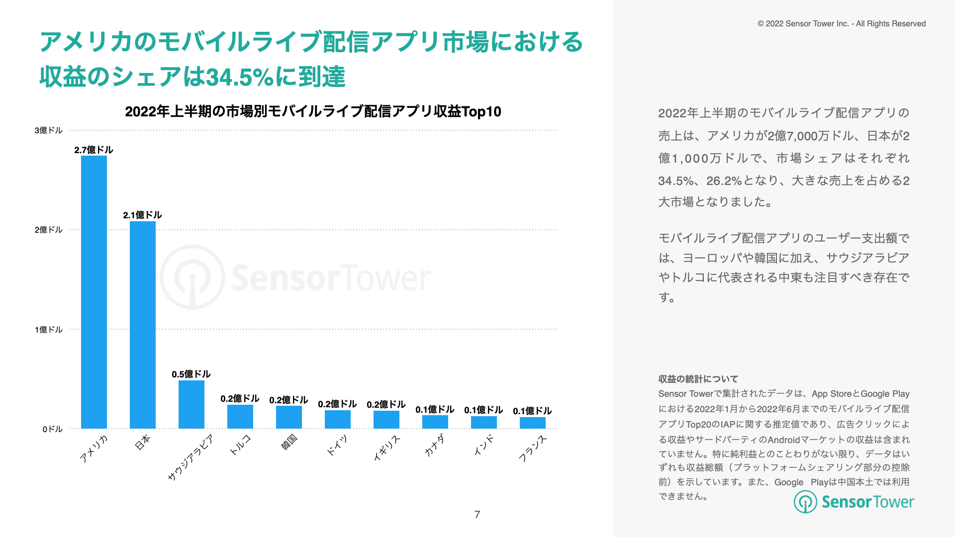 2022年上半期のモバイルライブ配信アプリの売上は、アメリカが2億7,000万ドル、日本が2億1,000万ドルで、その市場シェアはそれぞれ34.5%、26.2%を占める2大市場となりました。