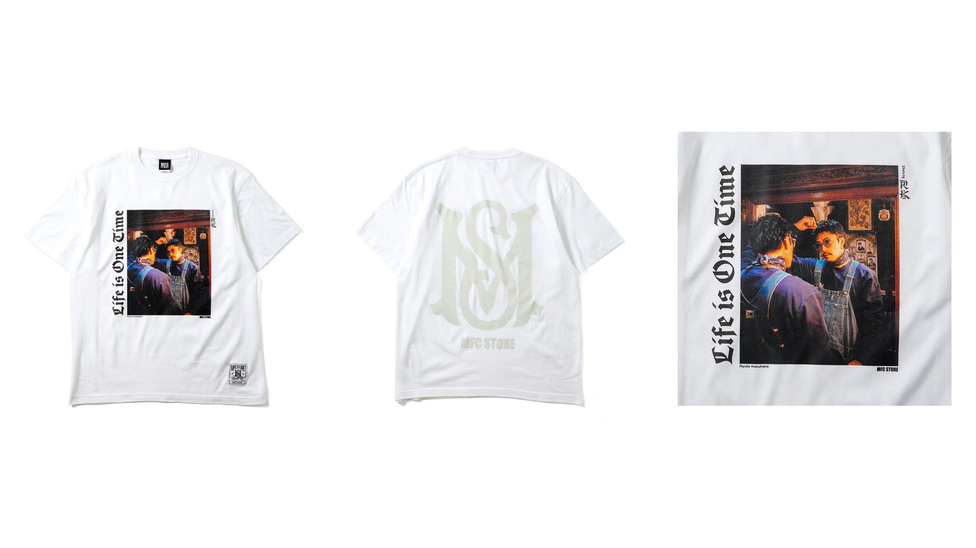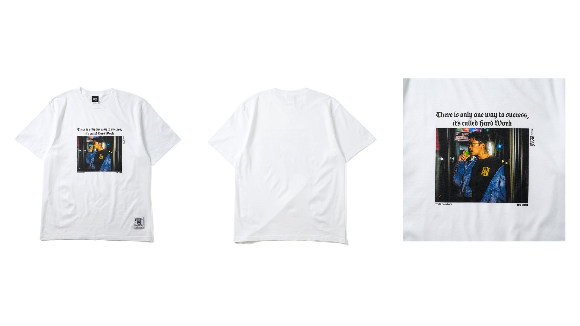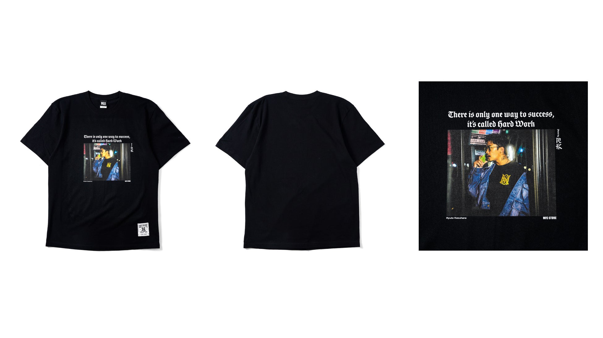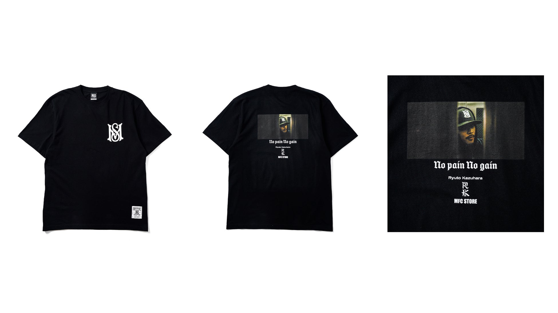 本コラボレーションでは、MFC STOREの最旬LOOKを落とし込んだTシャツ3型が登場します。数原 龍友氏をモデルに起用し、RK氏によって撮り下ろされたスペシャルなLOOKと、数原 龍友氏の好きな3つの言葉“There is only one way to success, it’s called hard work.(成功への道はそれしかない、それは努力と呼ばれるものだ)”、“Life is One Time.(人生は一度きり)”、“No pain No gain.(痛みなくして得るものなし)”のテキストをそれぞれのアイテムに配置。MFC STOREの頭文字から取ったシグネチャーロゴ“MS LOGO”のピスネームに加え、MFC STORE、数原 龍友氏、RK氏の3者のロゴを施したコラボレーションならではのアイテムとなっております。