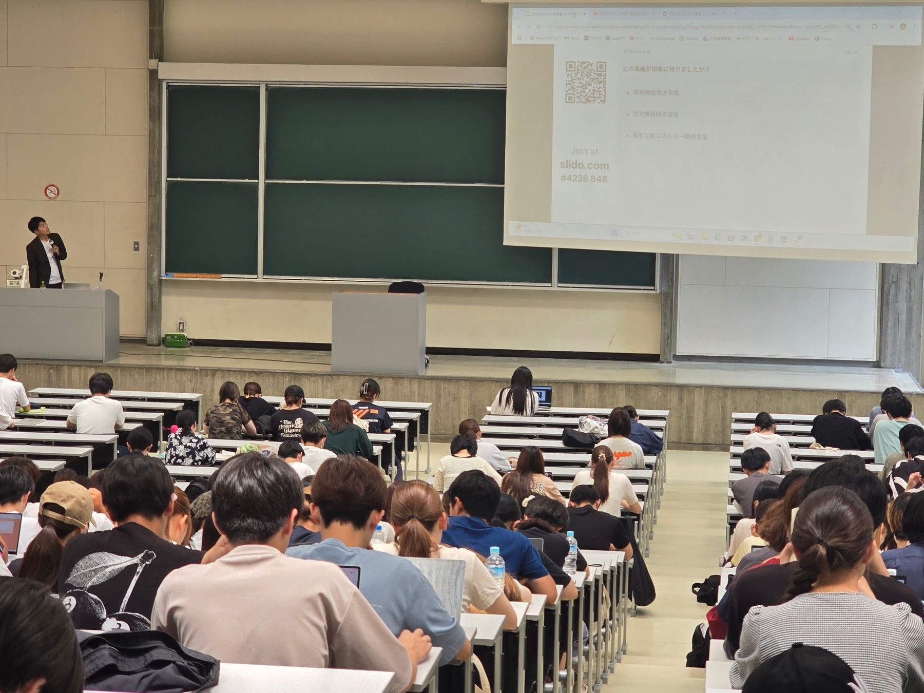 当日は講義には約400名の学生が出席、ダイキアクシスからは経営企画部の2名が登壇しました。講義では一方的な説明にとどまらず、オンラインツールを活用したリアルタイムアンケートの実施により、多くの学生が講義へ参画していただきました。